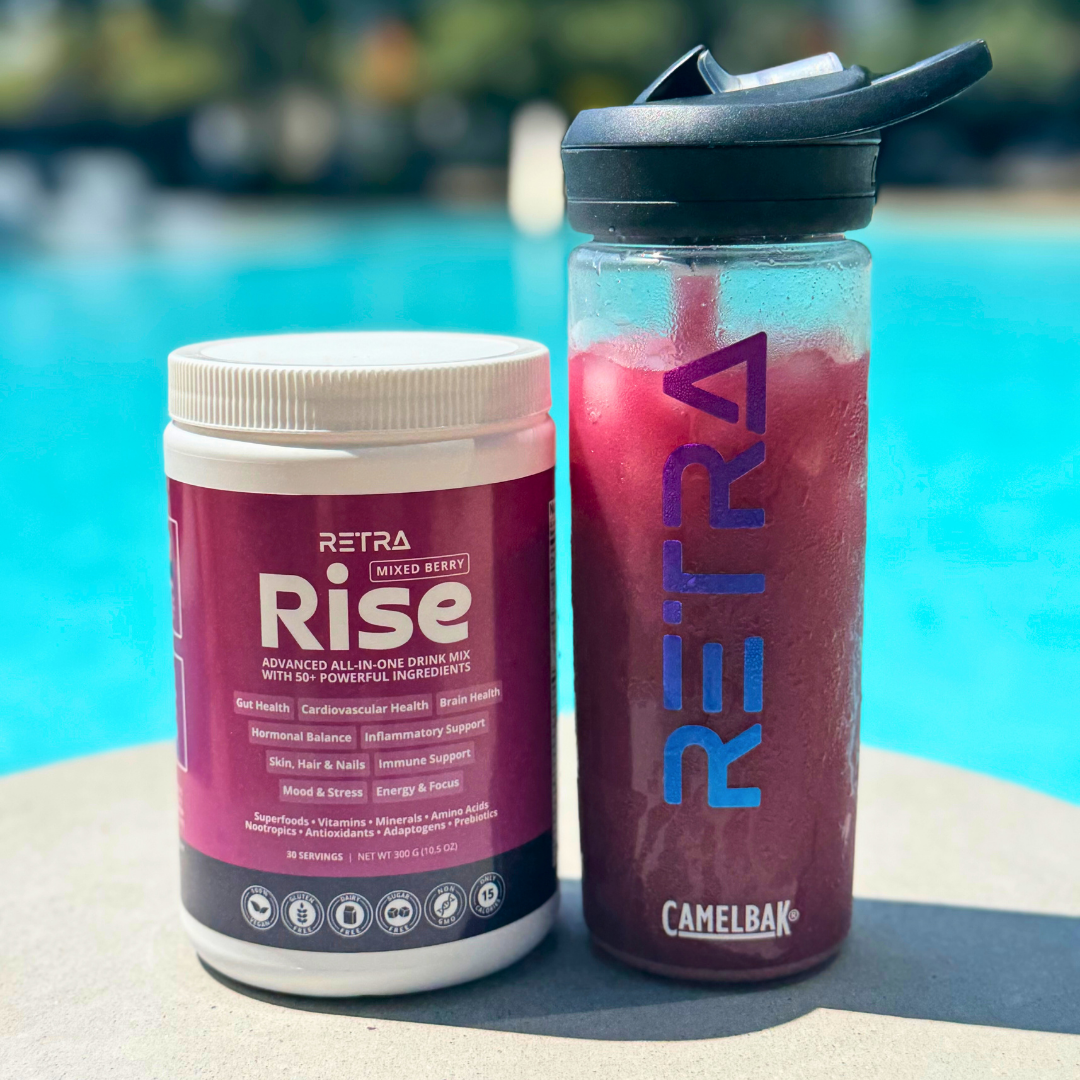 Retra Rise is the advanced all-in-one daily wellness mix that helps you rise above fatigue, stress, brain fog, and more.